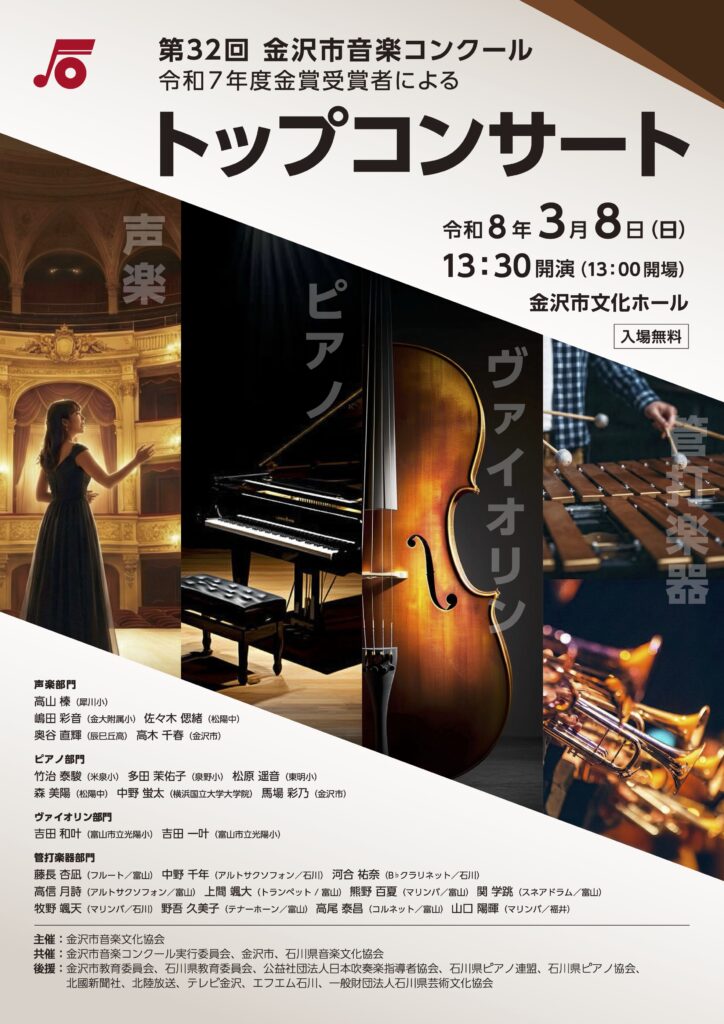 2025年(令和7年度)に開催された「金沢市音楽コンクール」において、各部門で優秀な成績を収め、金賞に輝いた受賞者たちによる「トップコンサート」を開催いたします。