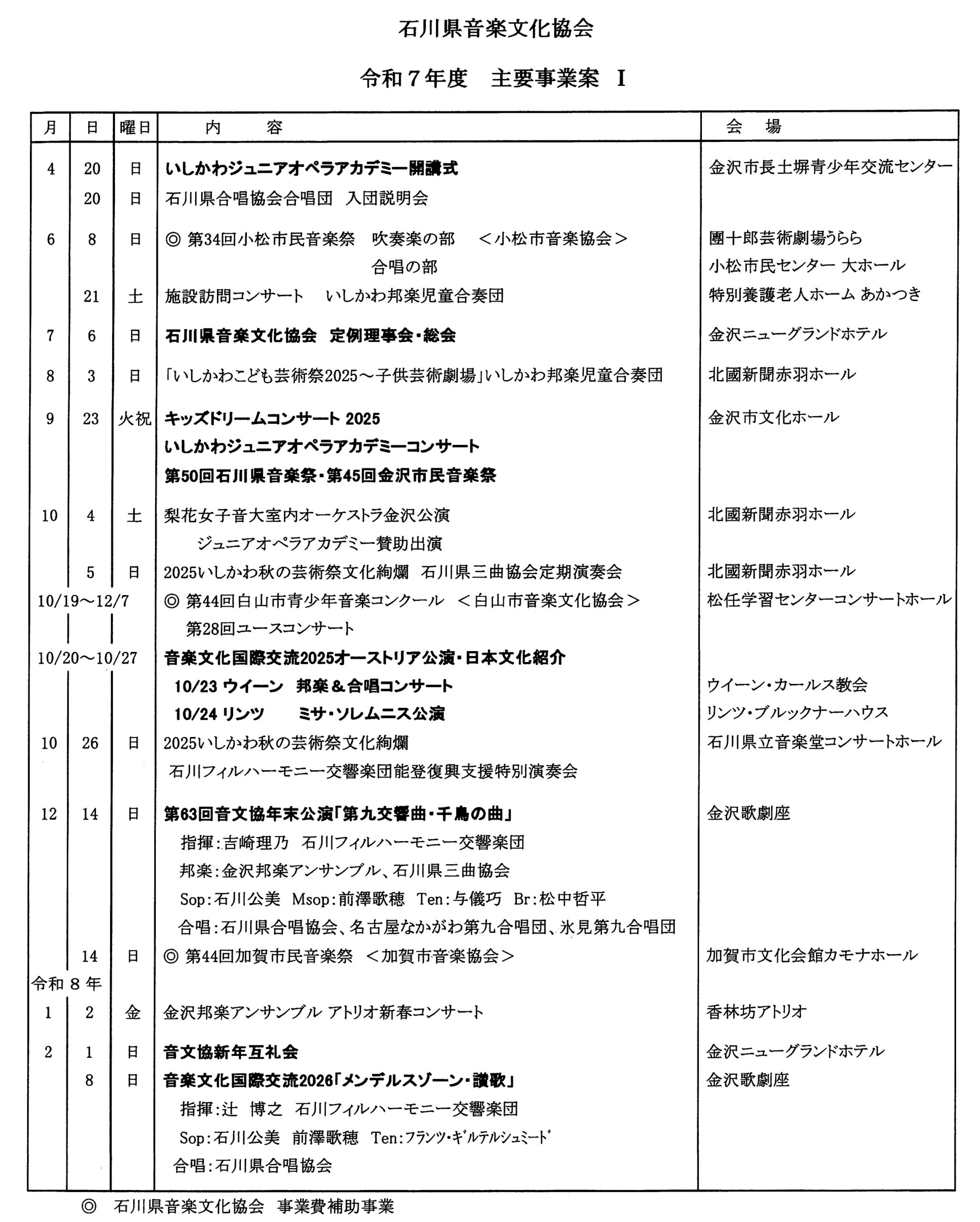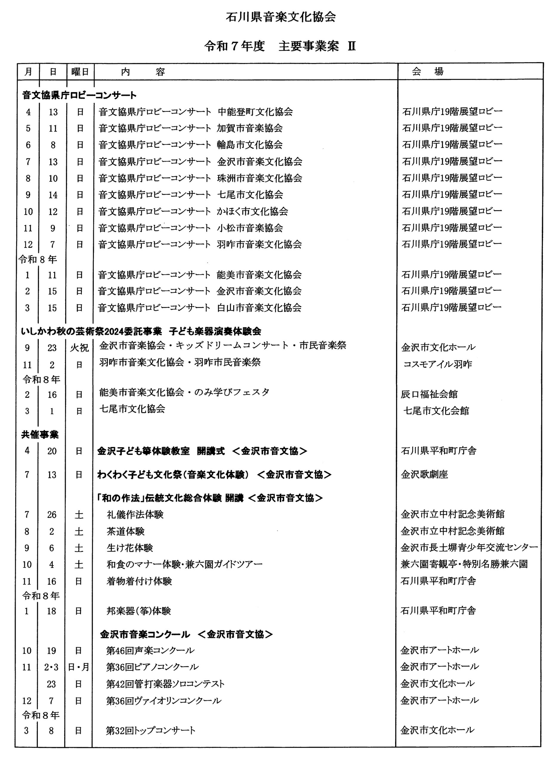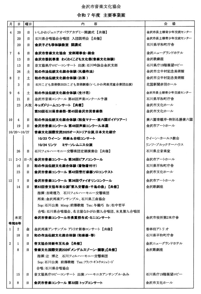 令和7年度の石川県音楽文化協会と金沢市音楽文化協会の事業計画です。コンサート等にはぜひ多くの方のご来場をお待ちしております。計画は変更になる場合がありますので、詳細については事前にご確認ください。